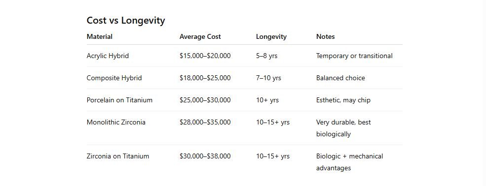 Choosing the right material is important because it impacts how clean your teeth stay, how durable your prosthesis is, and how your gums and bone respond over time.